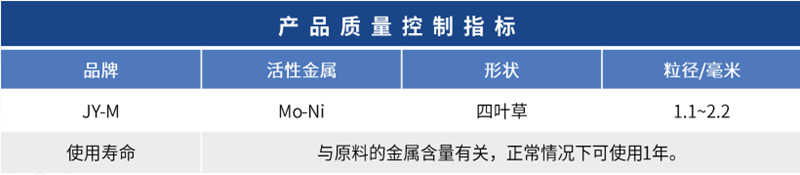 JY-M催化劑是一種重油加氫脫金屬催化劑。作為固定床重油加氫處理工藝中的支撐催化劑,具有孔徑大、孔徑大、酸性弱等特點(diǎn),可去除加氫原料中的金屬雜質(zhì),防止反應(yīng)器床壓降增大,保護(hù)下游。主催化劑作用良好,性能優(yōu)于同類進(jìn)口催化劑。